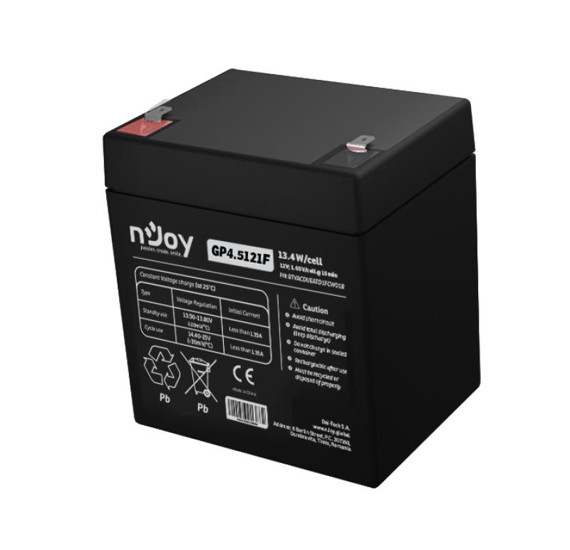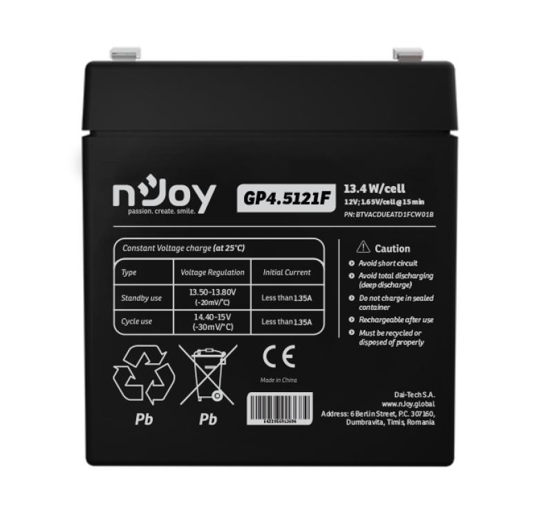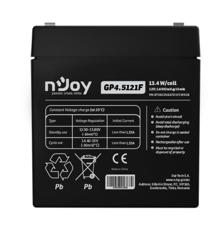 Acumulator nJoy GP4.5121F 12V Capacitate 14,95W/cell evaluat la 1.65V/cell @ 15 min, Tensiune 12V, Tip VRLA, Caracteristici Sigilata complet si fara intretinere, Peste 260 de cicluri la 100% DOD, Utilizare standard 3-5 ani, Auto-descarcare redusa, Conectori : F1 – Faston Tab 187