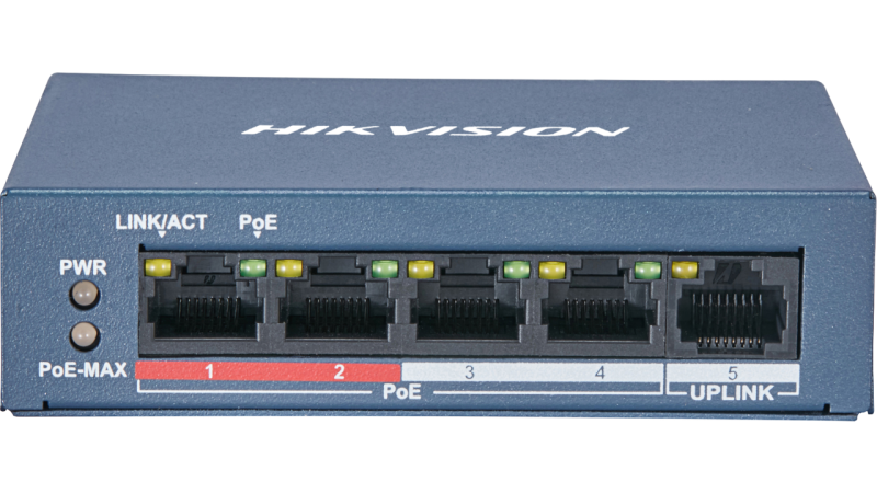 Switch POE 4 porturi Hikvision DS-3E0105P-E/M(B), fara management; 4x 100MPoE port, 1x 100M uplink port, 802.3af/at, PoE power budget 35W ,distanta transmisie: 250m;