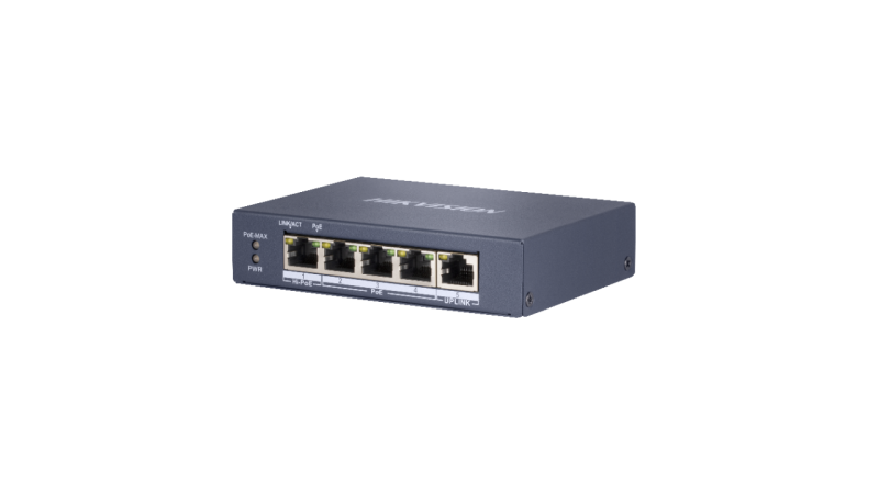 Switch 5 porturi POE Gigabit, Hikvision DS-3E0505HP-E, fara management, Layer 2, 3 × gigabit PoE ports, 1 × gigabit Hi-PoE port and 1 × gigabit RJ45 port, RJ45 port, full duplex, MDI/MDI-X adaptive, standard: IEEE 802.3, IEEE 802.3u, IEEE 802.3x, and IEEE 802.3ab, Store-and-forward switching, long-distance transmission: ports 3 si 4 ( pana la 300metri distanta), MAC address table: 2 K, Hi-PoE port: port 1 ( power 60 W) si POE port 2-4 ( port power 30W), material meta, dimensiuni: 121 mm × 88.1 mm × 27.6 mm, greutate: 0.27 kg